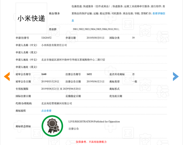 其中, 第32620452号“小米快递”商标于2019年6月21日获准注册,注册类别为第39类,服务范围包括“包裹投递,快递服务(信件或商品),快递服务,运载工具故障牵引服务,船运货物,旅行陪伴,贵重物品的保护运输,司机服务,运输,商品包装,导航,货物贮存”等服务,专用权期限至2029年6月20日。(文|AI财经社 饶翔宇 编|王晓玲)