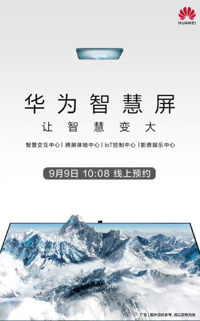 华为在海报中将智慧屏定位做四个中心,包括智慧交互中心、跨屏体验中心、IoT控制中心、影音娱乐中心等,Slogan是“让智慧变大”。另外海报中出现了升降摄像头、超窄边框等元素。