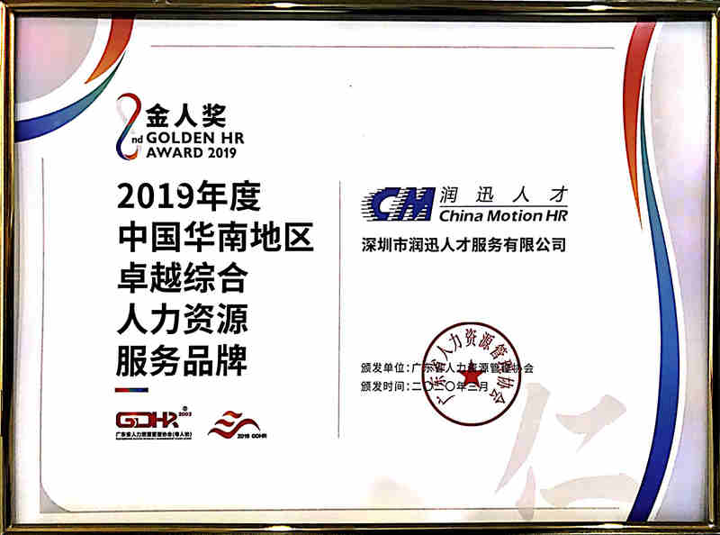 2020年3月26日,由广东省人力资源管理协会(简称“粤人协”)举办的2019年度中国华南地区人力资源创先争优(金人奖)公益评选活动(简称“金人奖”)圆满结束。在300多家参选单位中,深圳市润迅人才服务有限公司(简称“润迅人才”)与北京科锐、广东方胜、任仕达等17家企业被评为2019年度中国华南地区卓越综合人力资源服务品牌。